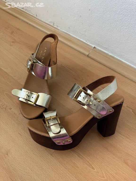 Jonak- nové, luxusní sandály, letní boty, měkká kůže, velmi stabilní, pohodlná mělká stélka, velikost 38, mamka je mela 2x na sobě- viz stav neochozene podrážky a podpatku. Na pár místech menší odřenina, ale vše zohledneno v ceně. Pc 4.790 kc.