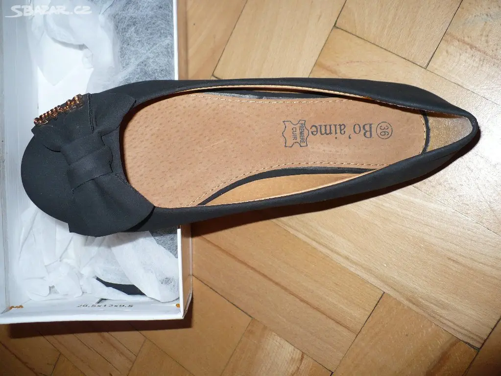 Pordám černé baleriny úplně nové zabalené v originál krabici.Stélka kožená jinak boty syntetika. Kvalitní zpracvování. Vel. 36. Délka stélky 22,5cm